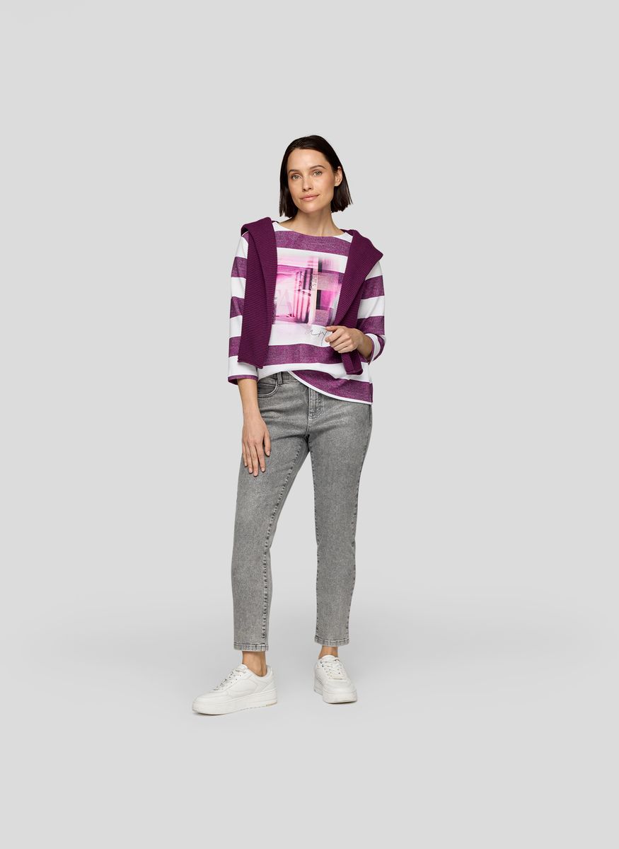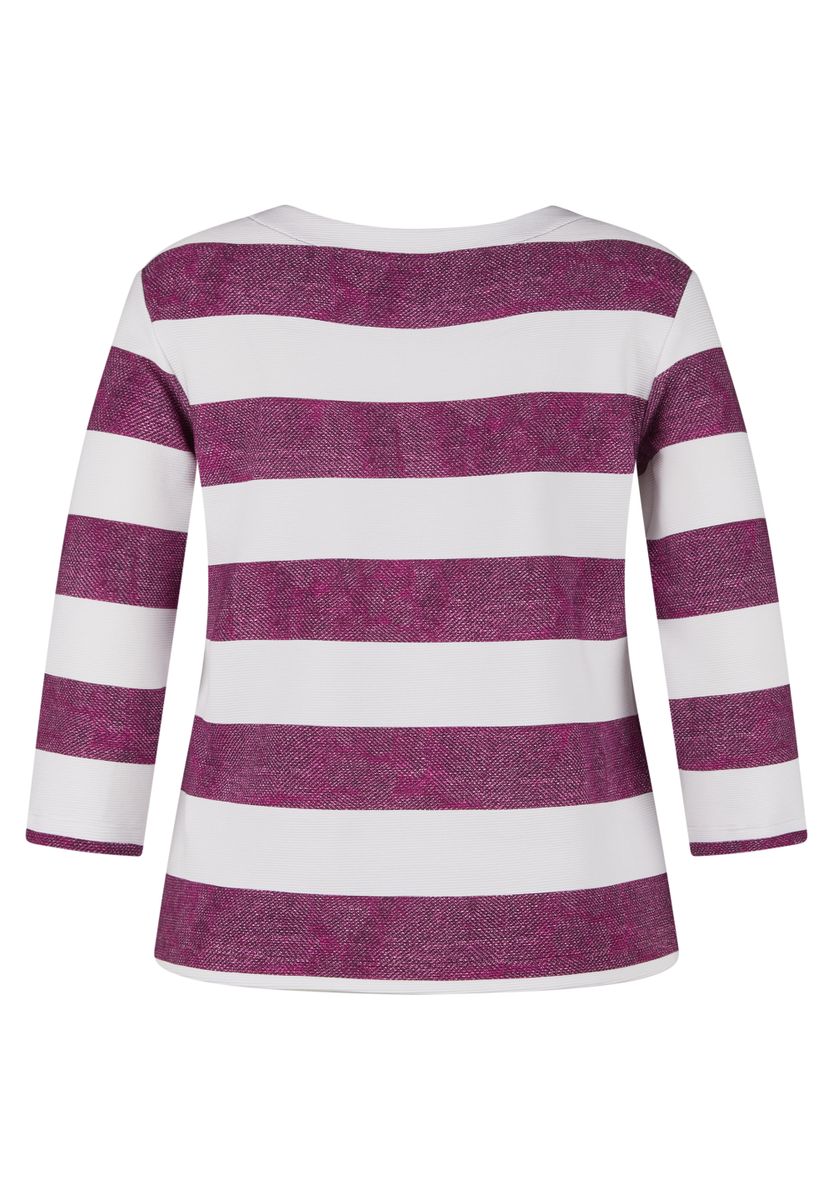 Dieses Shirt überzeugt mit einem sportlich-modernen Look. Die strukturierte Ware mit breiten Blockstreifen wird durch einen platzierten Fotodruck und feine Ziersteine auf der Vorderseite aufgewertet. Der U-Boot-Ausschnitt unterstreicht den femininen Stil, während der Elasthananteil für angenehmen Tragekomfort sorgt. Ideal für lässige Freizeit-Outfits. Pflegeleichtes Material. U-Boot-Ausschnitt. Dekorative Ziersteine. Bequeme 3/4-Ärmel. Druck vorne. Farbe