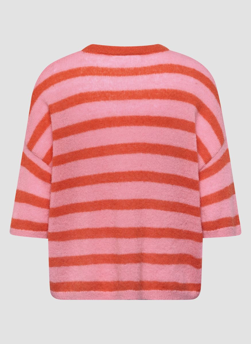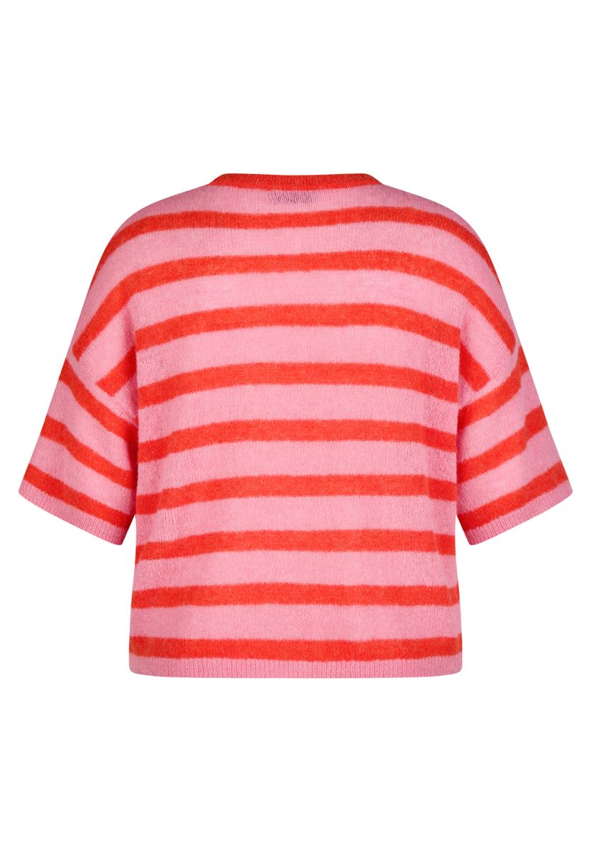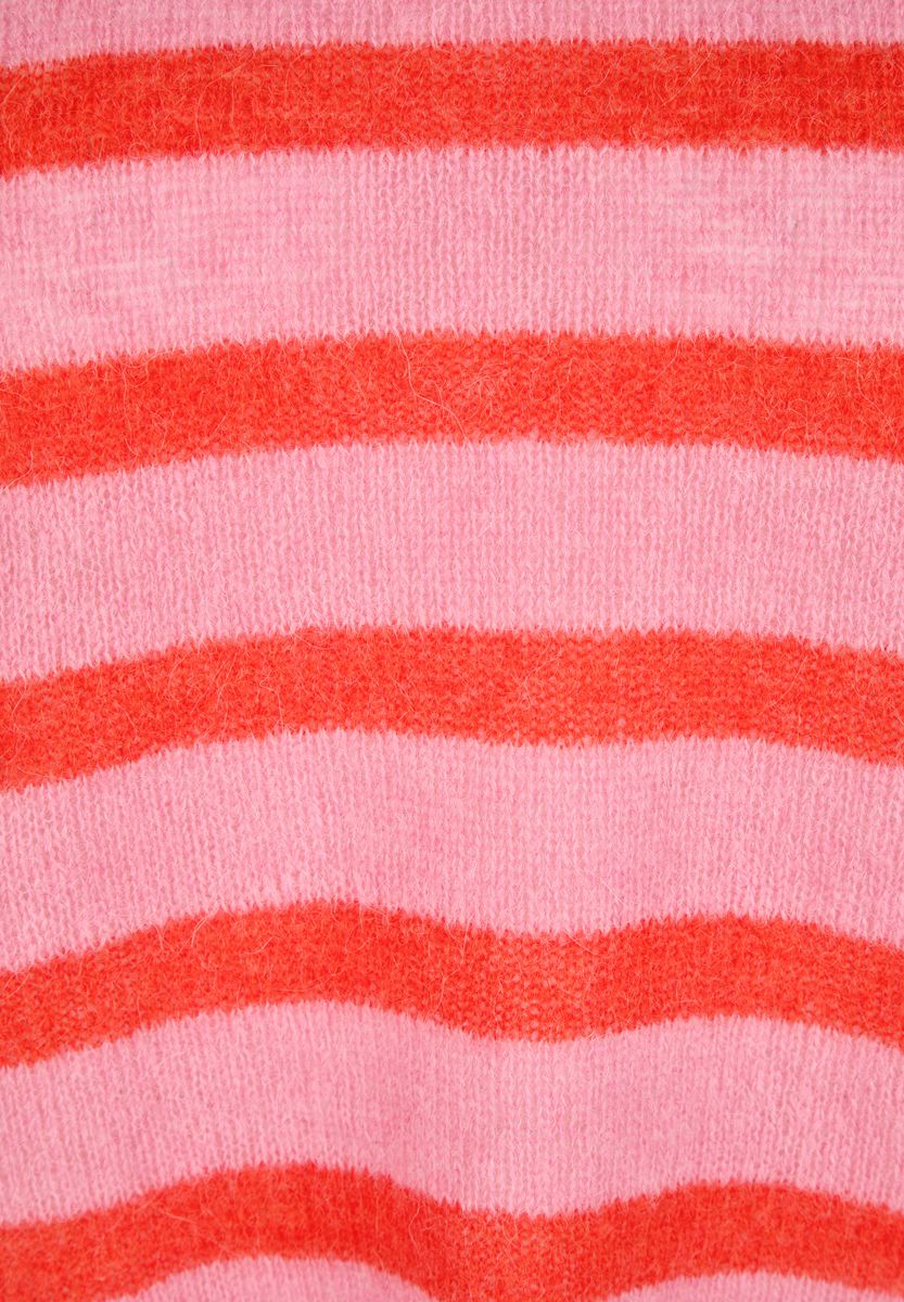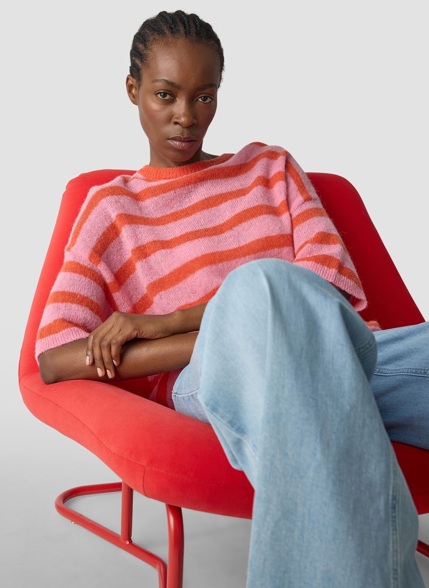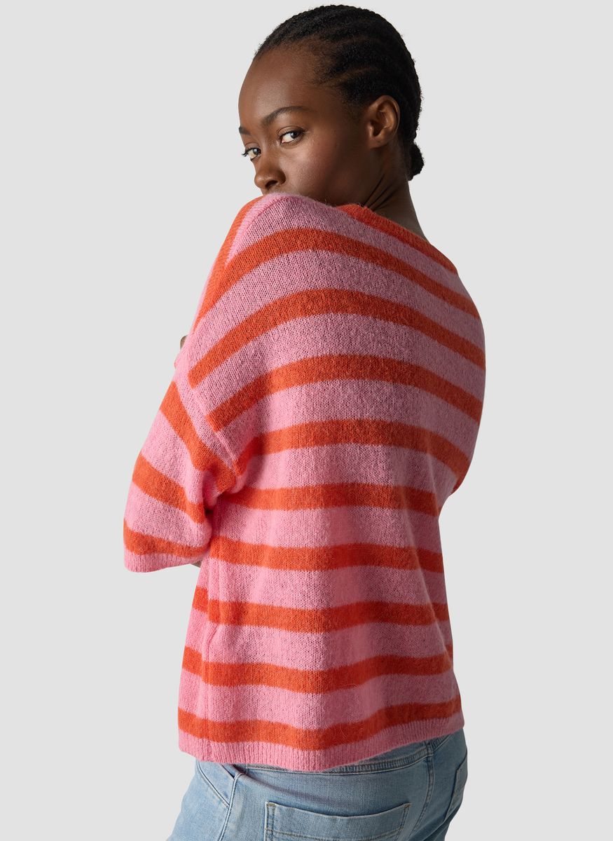 Dieser locker geschnittene Streifenpullover punktet mit einem hohen Anteil an weichen Naturfasern: Alpaka und Wolle sorgen für einen besonders kuscheligen Tragekomfort, der durch das luftige Maschenbild noch verstärkt wird. Der Rundhalsausschnitt und die halblangen, überschnittenen Ärmel unterstreichen den entspannten Look. Ideal für alle, die es weich, warm und stylish mögen. Alpaka- und Wollanteil für weichen Griff. Locker fallende Oversized-Form. Breite Ringel in kräftigen Farben. Überschnittene Schultern. Gerippter Rundhalsausschnitt. Farbe